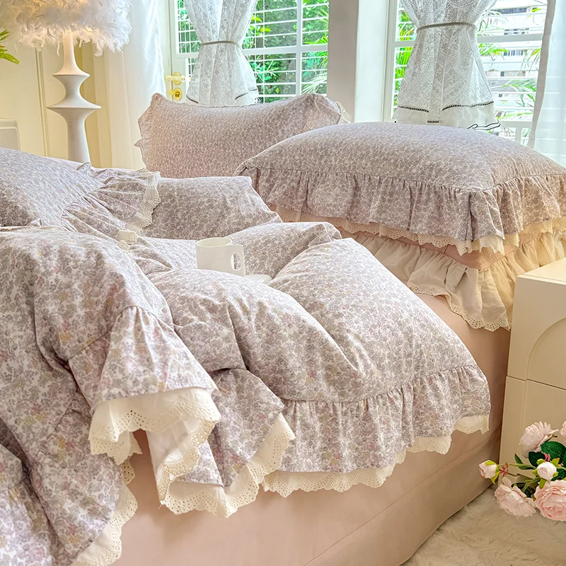 Корейский стиль принцессы, маленькие цветочные кружевные оборки, 600TC, хлопок, матовый комплект постельного белья из 4 предметов, пододеяльник, плоская/простынь, наволочки