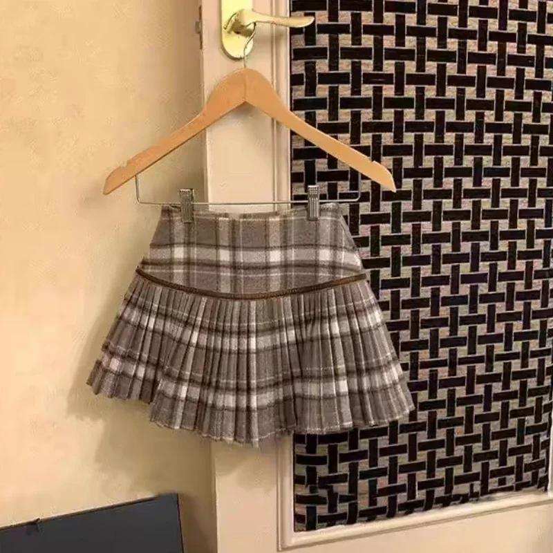 Корейский стиль ретро пикантная девушка клетчатая плиссированная юбка осень зима колледж стиль шерстяная мини юбка с высокой талией милая кавайная юбка M бежевый