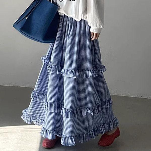 Корейский шик, винтажная эластичная талия, пэчворк, оборки, клетчатая многоярусная юбка макси для женщин - Синяя клетчатая юбка-тортик 2XL синий