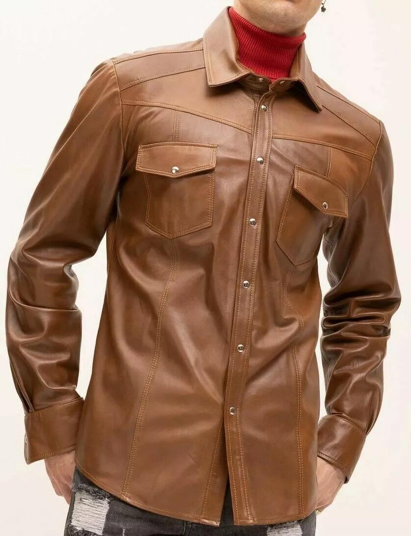 Коричневая рубашка для вечеринки из овчины, формальная, стильная, 100% повседневная, кожа, настоящая ручная работа, для мужчин S коричневый