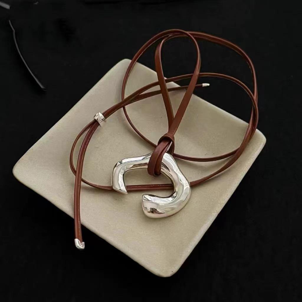Коричневое кожаное колье-шнурок с серебряной абстрактной подвеской в виде человеческого тела – осенне-зимняя легкая роскошь, ключичная цепочка коричневый