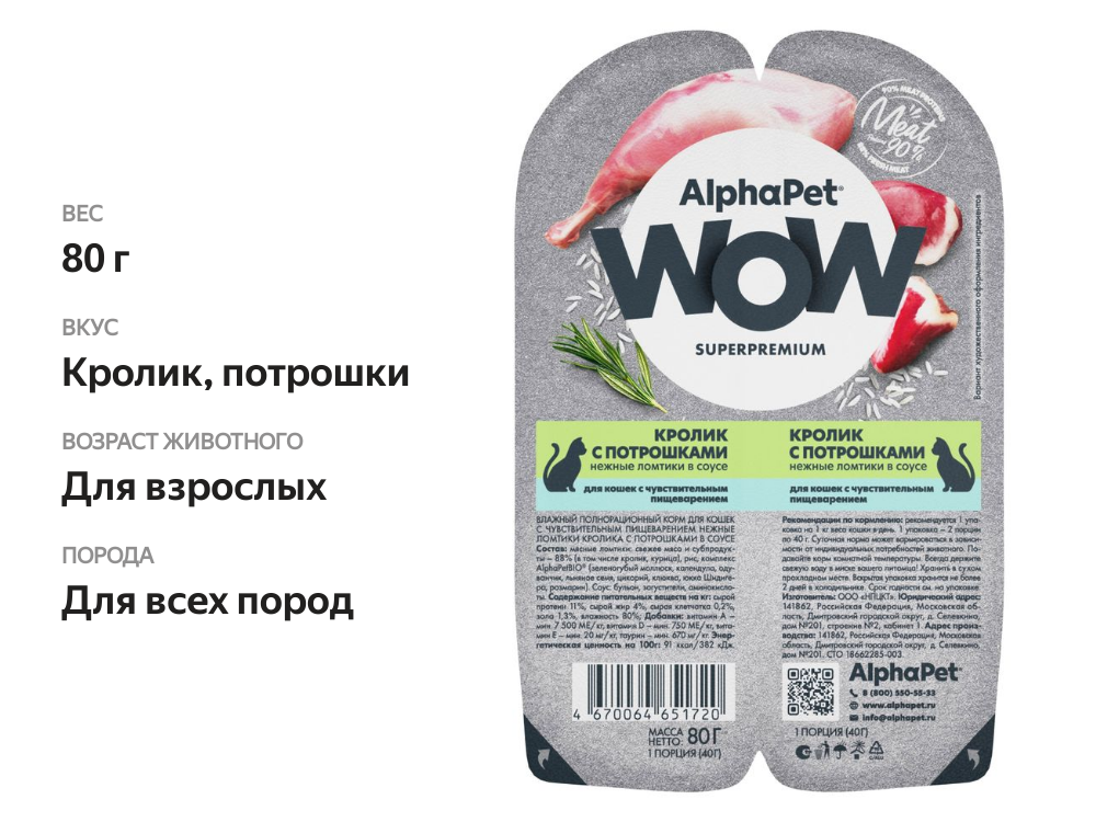 Корм влажный для кошек AlphaPet с чувствительным пищеварением Кролик с потрошками нежные ломтики в соусе 80 г
