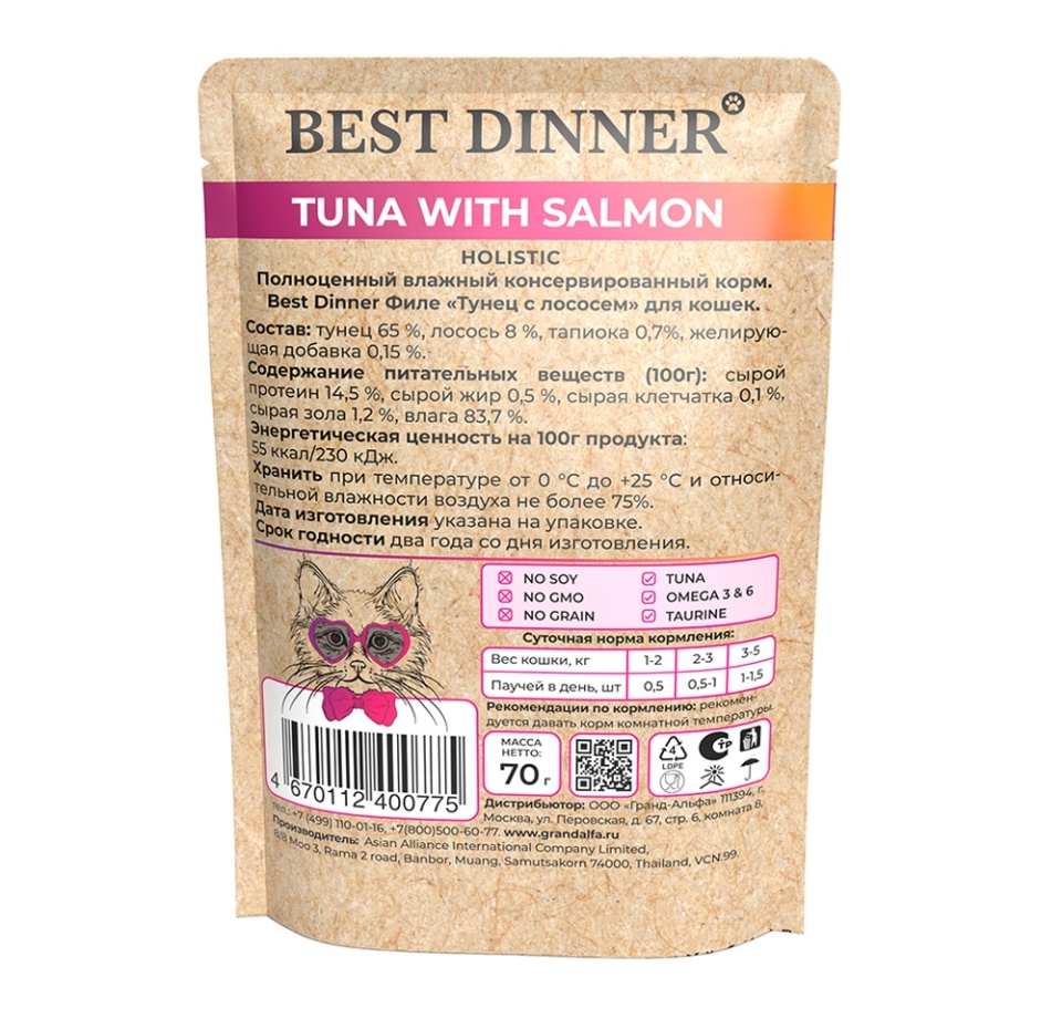 Корм влажный Best Dinner Holistic для кошек Тунец с лососем в соусе, 70 г