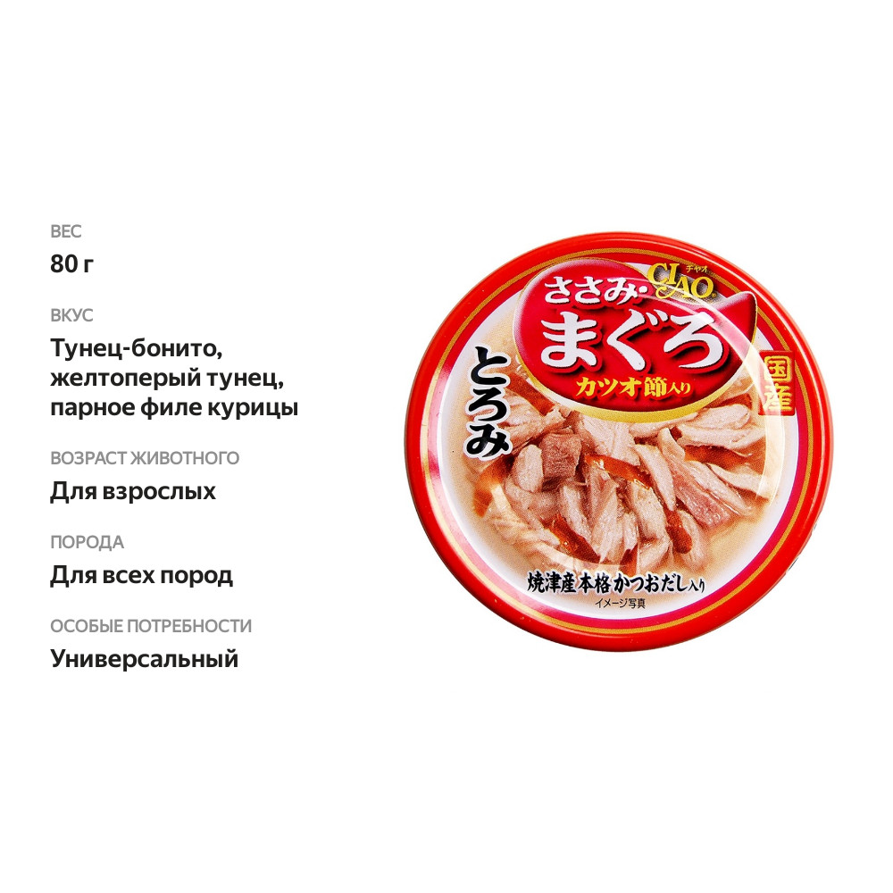 Корм для кошек Inaba Ciao карпаччо из мраморной вырезки тунца-бонито, желтоперого тунца и парного филе курицы 80 г
