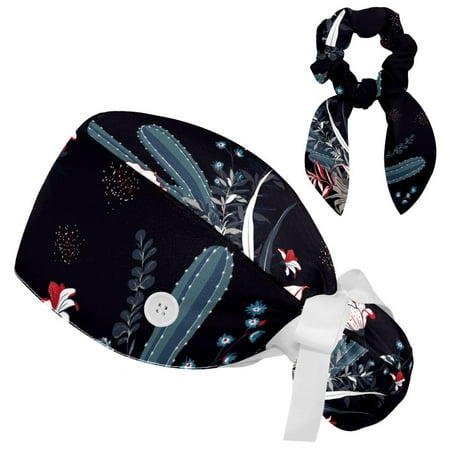 Working Cap with Buttons and Sweatband Scrub Hat Bouffant Caps with Scrunchie Cactus Tie Back Hats