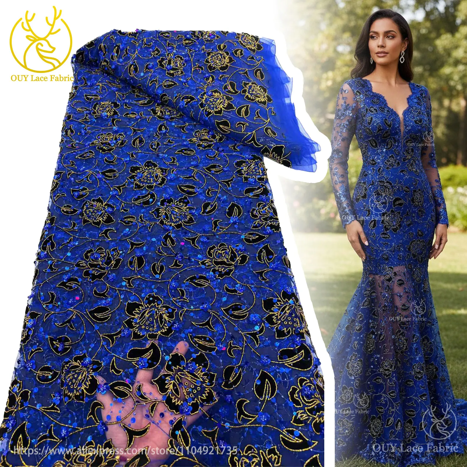 Королевская синяя африканская бархатная кружевная ткань с цветочной вышивкой, 2022, Нигерия, блестящая золотая блестящая кружевная ткань с блестками, вечерние платья
