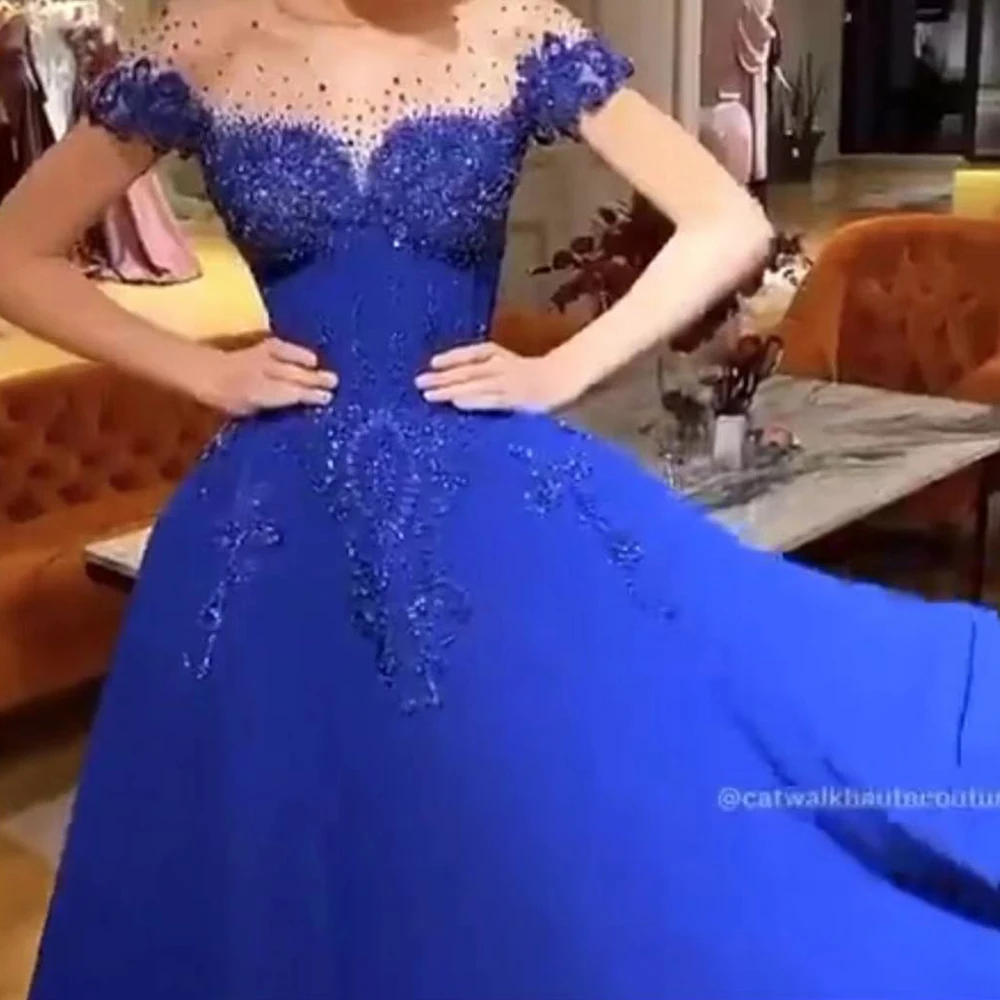 Королевский Синий Выпускные платья 2020 отвесный вырез лодочкой Тюль Бисероплетение Блестки Кристалл Вечерние платья формальное платье