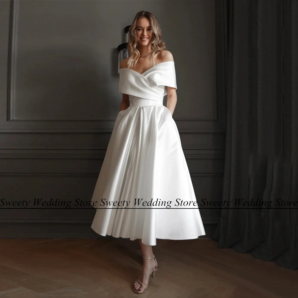 Короткое свадебное платье Jiayigong, маленькие белые платья с открытыми плечами и V-образным вырезом, плиссированное ТРАПЕЦИЕВИДНОЕ атласное свадебное платье, маленькое черное платье