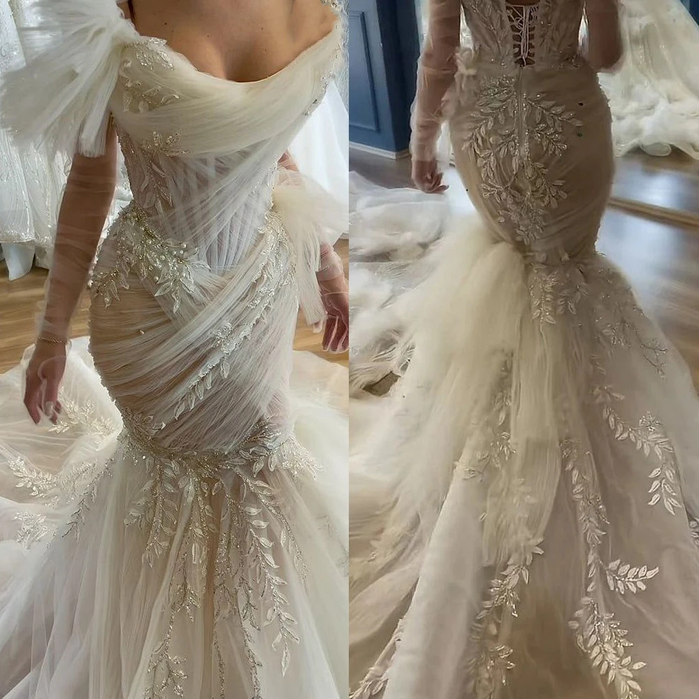 Корсет с рюшами Свадебные платья русалки с перчатками Кружевные аппликации с открытыми плечами Длинные свадебные платья цвета слоновой кости в стиле бохо на шнуровке с овальным вырезом
