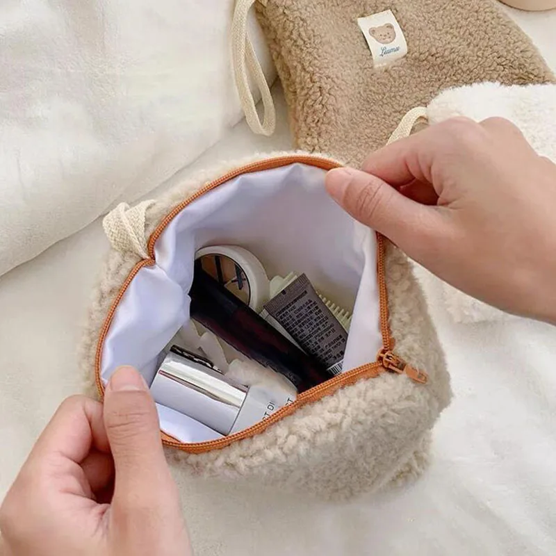 Косметичка из овечьей шерсти, милый медведь, плюшевая сумка для хранения макияжа, сумка для канцелярских принадлежностей, большая вместительная дорожная косметичка, органайзер для макияжа