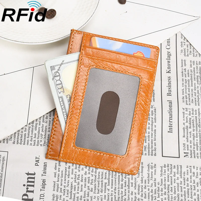 Кошелек мужской из натуральной кожи с RFID-защитой, держатель для визиток, простой в применении, вощеная, масляная, винтажная, плоская, широкая, прозрачный, большого размера, для удостоверения личности, чехол Wndow