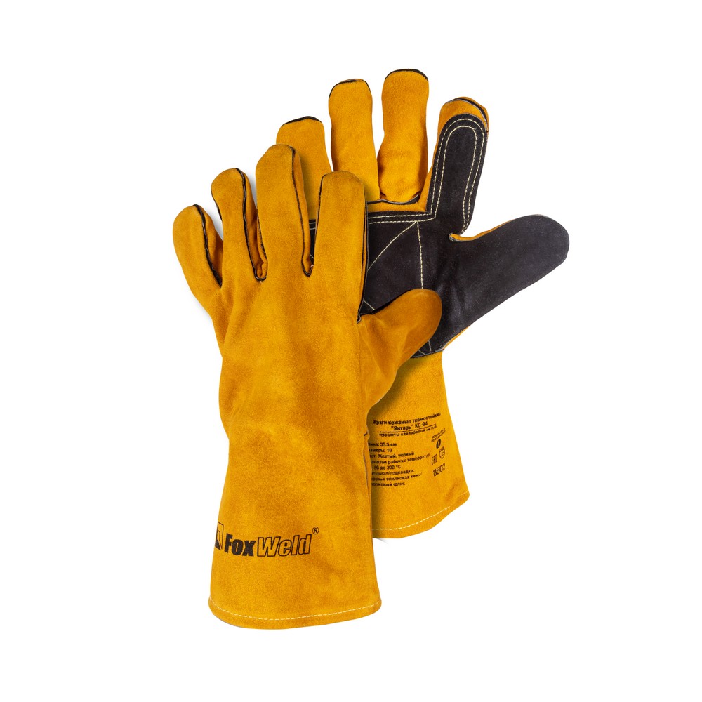 Краги для сварочных работ кожаные коровья спилковая кожа, коровья спилковая кожа (усиленная), от искр и брызг расплавленного металла при проведении сварочных работ, XXL, черный/желтый, FoxWeld «Янтарь» КС-04 (8502), КС-04