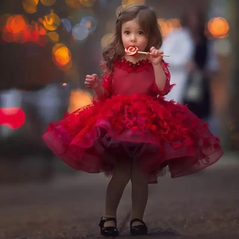 Красивые Красные Платья с цветочным принтом для девочек, пышное бальное платье из тюля с длинными рукавами, платье для первого Святой причастия, до колена, изготовление на заказ