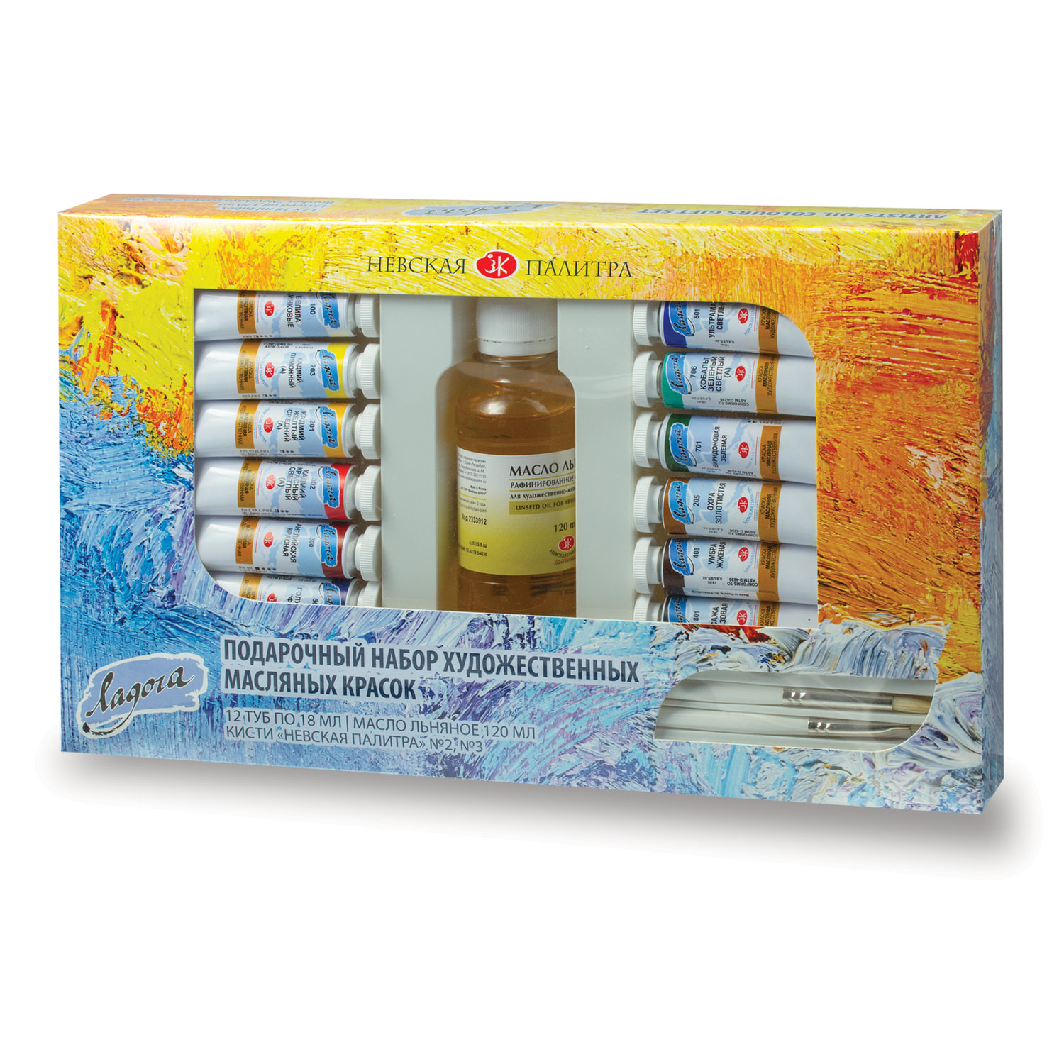 Краски масляные 1 шт./12 цветов, разноцветный, 18 мл, коробка, Комплектация: кисть - щетина, длинная ручка, круглая №3, кисть - щетина, длинная ручка, плоская №2, масло льняное рафинированное отбеленное 120 мл., Невская палитра Ладога 1241967 (191036), 12