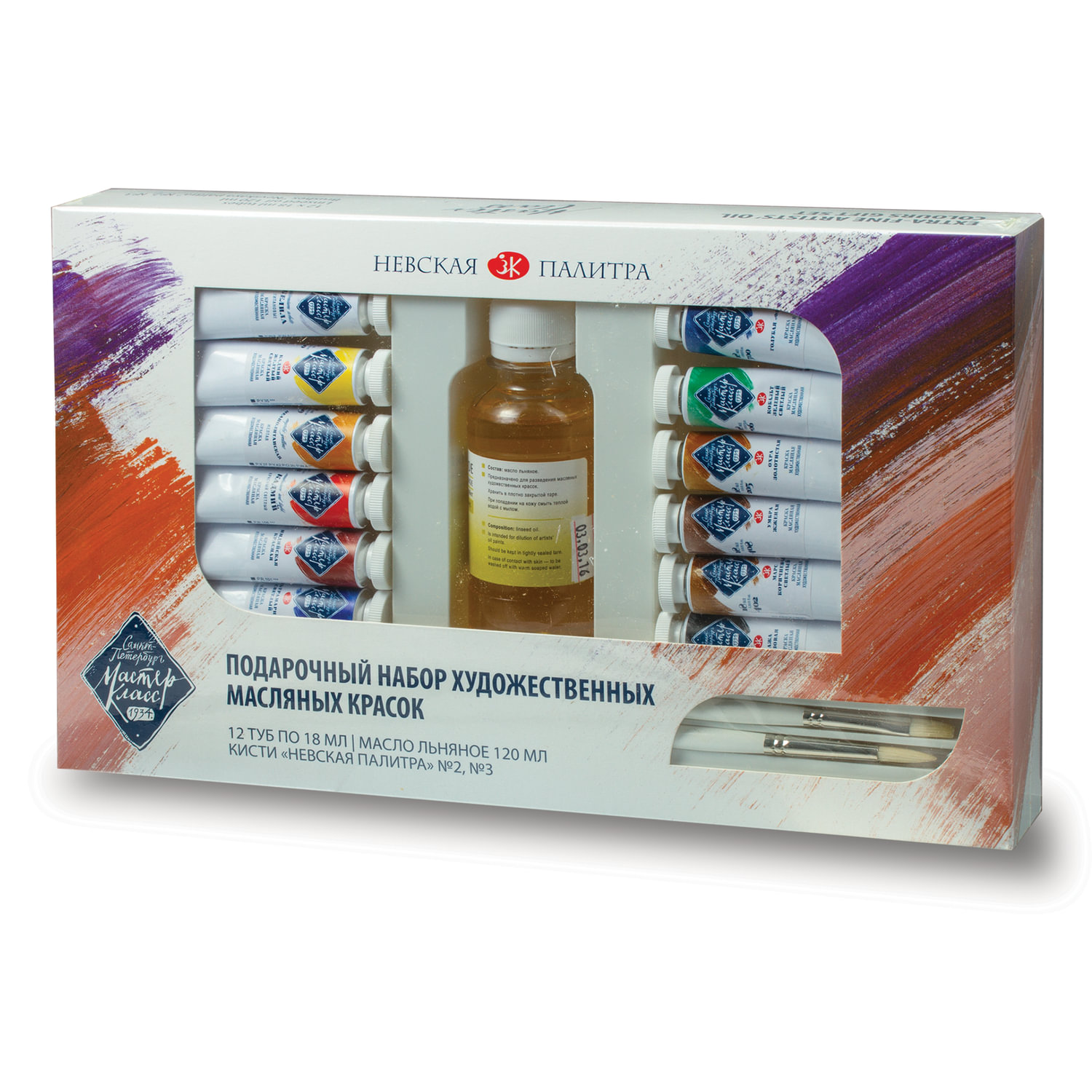Краски масляные 1 шт./12 цветов, разноцветный, 18 мл, туба, с кистью, Комплектация: кисть - щетина, длинная ручка, круглая №3, кисть - щетина, длинная ручка, плоская №2, масло льняное рафинированное отбеленное 120 мл, Невская палитра Мастер класс 1141965