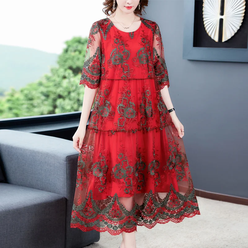 Красная женская модная Тяжелая вышитая сетчатая шелковая Летняя коллекция 2023, тонкая юбка, элегантное вечернее платье, платья