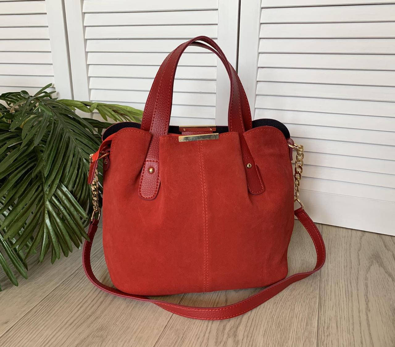 Красная замшевая женская сумка вместительная шоппер сумочка натуральная замша+экокожа, Красный