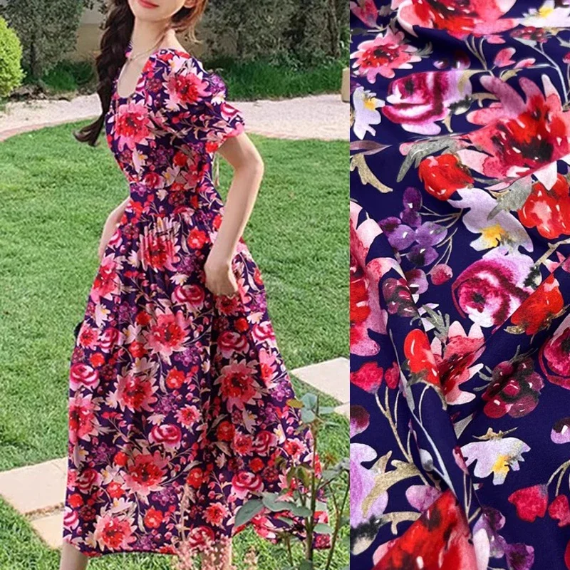 Красная синяя тонкая шелковая ткань с цветочным принтом для пижам, 93% шелк 7% спандекс Шелковая ткань крепдешин шириной 140 см, ширина 18 мм R12970