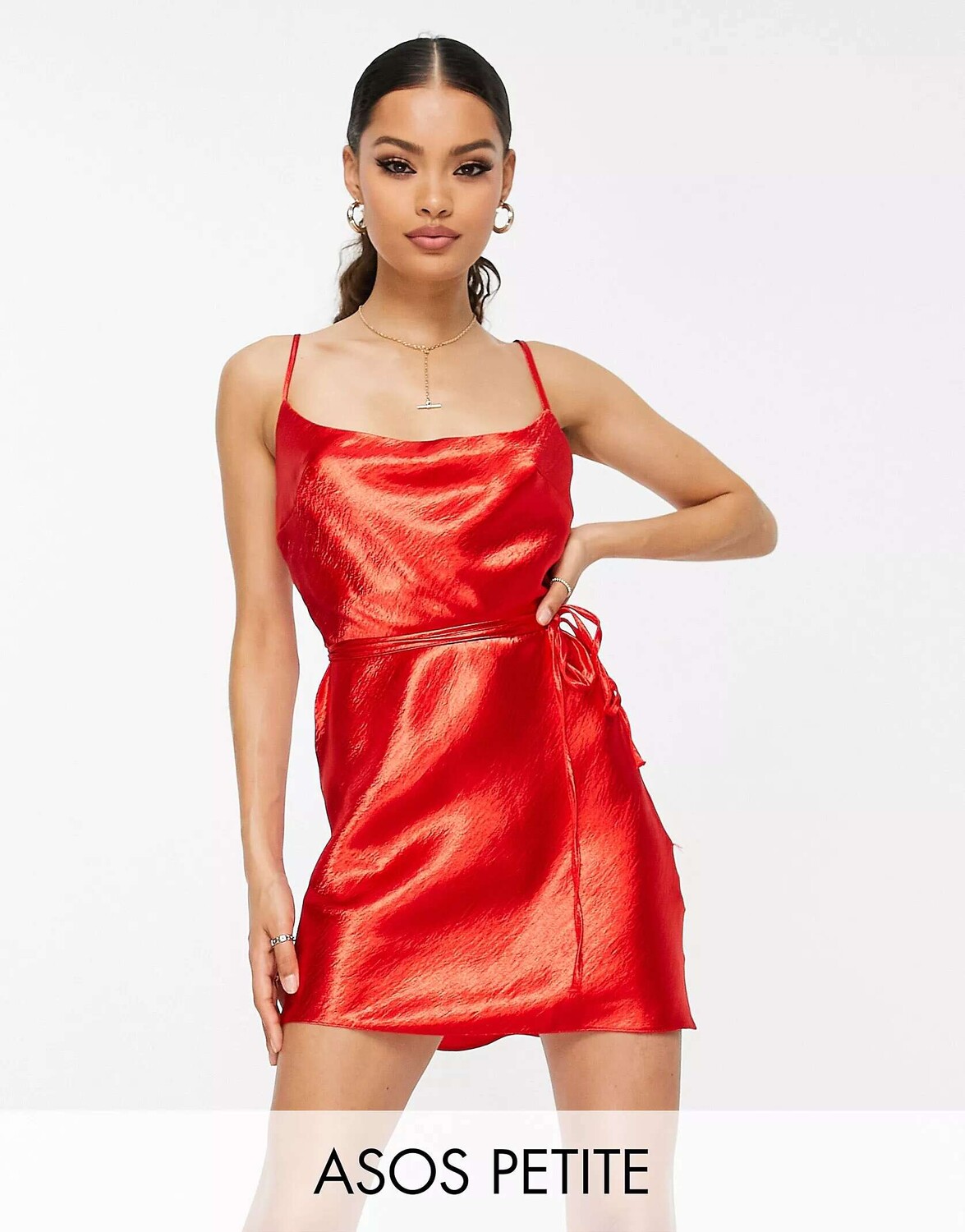 Красное атласное мини-платье на бретелях с завязкой на талии ASOS Petite, Красный