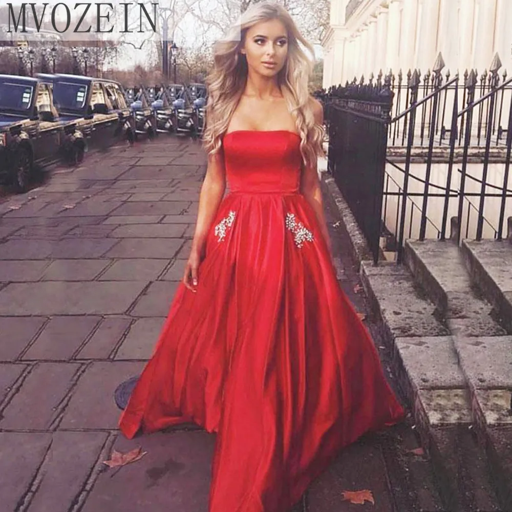 Красное платье для выпускного вечера 2023, вечернее платье без бретелек с карманами и бусинами, свадебное платье без рукавов, ТРАПЕЦИЕВИДНОЕ деловое платье, атласное Новое