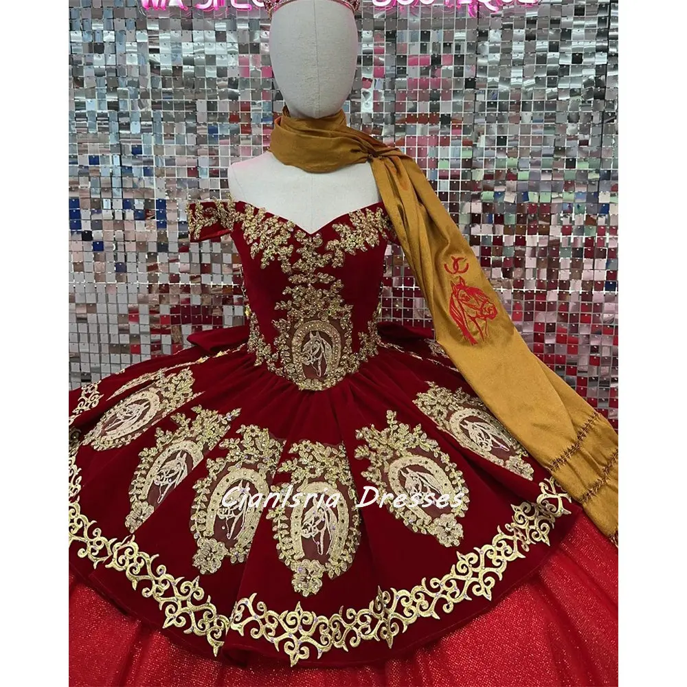 Красные бархатные Бальные платья с оборками и бантом, бальное платье с открытыми плечами, корсет с золотой аппликацией, Милые 15 бальных платья