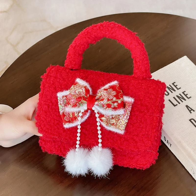 Красные шерстяные детские сумки на плечо с милым бантом и кисточками, сумки с бисером для маленьких девочек, маленькие квадратные сумки через плечо с милой цепочкой, подарок