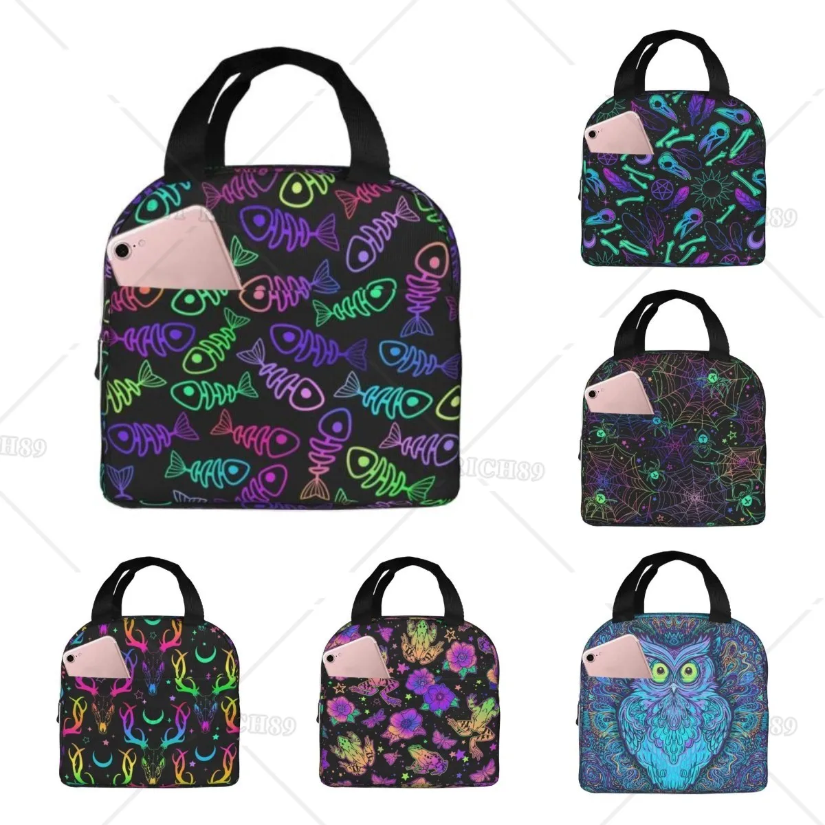 Красочная неоновая сумка для ланча с животными, кошка, летучая мышь, скелет, переносная алюминиевая утолщенная изоляционная сумка, многоразовый большой контейнер для ланча