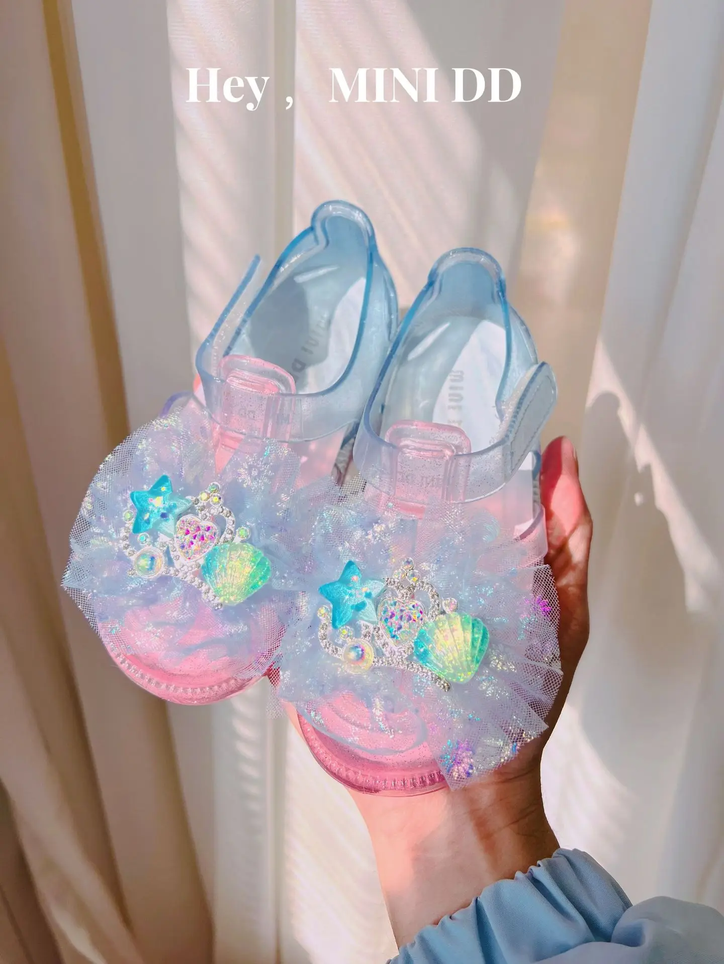 Красочные сандалии для девочек, новые летние детские милые прозрачные туфли в форме ракушки, пляжная обувь принцессы для девочек с короной Baotou на мягкой подошве
