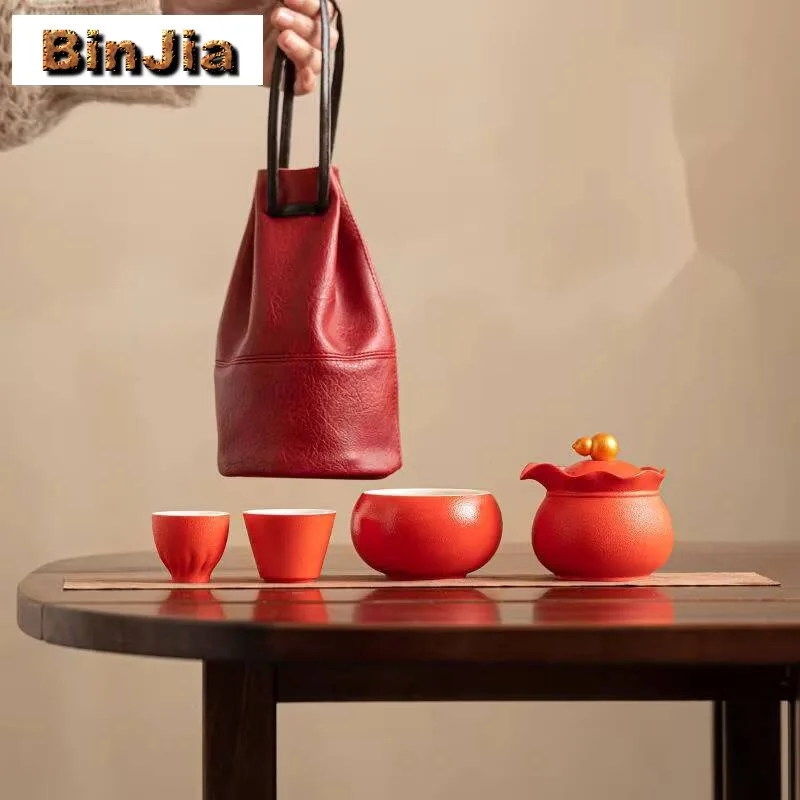 Креативный счастливый мешок, красный фарфоровый чайный сервиз, ретро 1, горшок, 3 чашки, портативная дорожная кожаная сумка, чайный сервиз, подарок