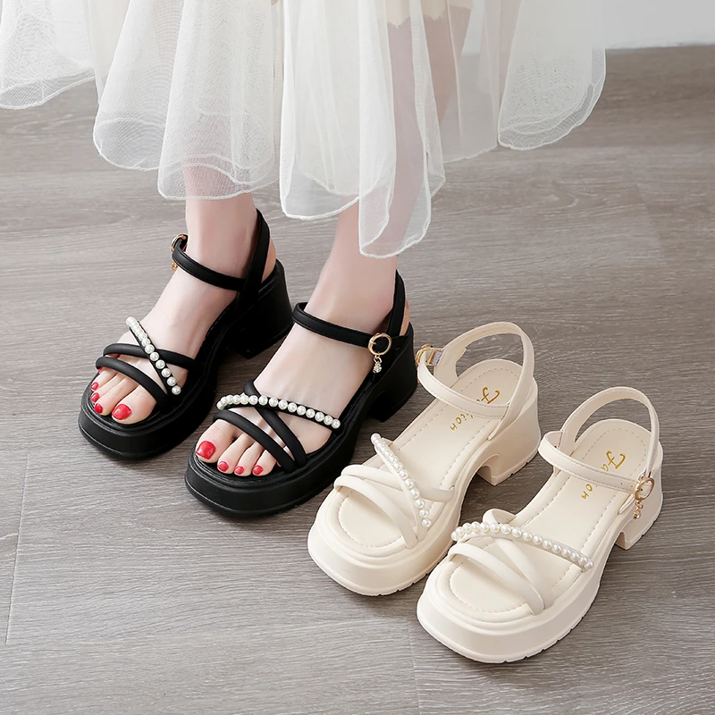 Новые летние элегантные сандалии с круглым носком и жемчугом для женщин, модные толстые и удобные банкетные сандалии на высоком каблуке