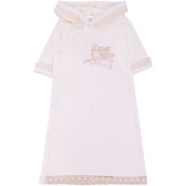Крестильное платье с капюшоном, тесьма, р-р 74, NewBorn, белый из коллекции NewBorn от отечественного швейного производства ТексПром предназначено для создания праздничного образа девочки во время торжественного обряда крещения. Платье представлено в коллекции NewBorn, которая сочетает в себе классические и современные тенденции в мире моды для новорожденных, при этом при технологии изготовления детской одежды сохраняются самые лучшие традиции: свободный крой, внешние швы и натуральные ткани. Платье с короткими рукавами и капюшоном выполнено из трикотажа, все края обработаны трикотажной бейкой золотистого цвета. Изделие имеет передний запах с застежками на кнопках, что обеспечивает его легкое одевание. Праздничный образ создается за счет отделки рукавов, капюшона и низа платья широким кружевом золотистого цвета и термонаклейки на передней полочке в виде ангела.