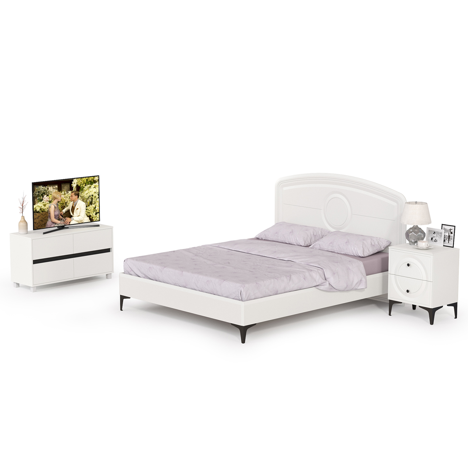 Кровать 1600 Валенсия с прикроватной тумбочкой и ТВ тумбой Квадро - стильная светлая спальня в популярном стиле ар-деко. Сп. м. 1600х2000 мм. 3 предмета мебели. Основным декоративным элементом является круг представленный фрезеровкой на фасаде в изголовье кровати. Выбирая двуспальную кровать Валенсия 11.36.01, Вы выбираете крепкий сон и уют. Ортопедическое основание 1600х2000 мм. с гнутоклееными ламелями входит в комплект, матрас приобретаются отдельно. Углубление под матрас - 100 мм. Рекомендованная высота матраса от 100 до 220 мм. Максимально допустимая нагрузка на 1 спальное место - 100 кг. Тумба прикроватная Валенсия 13.291 оборудована двумя удобными выдвижными ящикам. Ящики тумбы установлены на направляющие скрытого монтажа с доводчиками. Современная тумба под ТВ Квадро 13.277 придётся по вкусу любителям чёрно-белых акцентов в оформлении интерьера. Особый акцент данной модели - абсолютная геометрия дизайна и декоративная вставка фасадной части из анодированного алюминия. Наличие металлического элемента в конструкции тумбы значительно увеличивают её надёжность, прочность и долговечность. Конструктивно тумба имеет 4 одинаковой вместимости ящика, закреплённых на телескопических направляющих полного выдвижения. Фасады ящиков лишены ручек, открывание происходит за край фасада, чему способствует открытое пространство перед декоративной алюминиевой планкой. Верхний горизонт оборудован вырезом для размещения проводов мультимедиа аппаратуры. Опоры регулируются по высоте, что позволяет компенсировать неровность пола, и наделены пластиковыми подпятниками, что сохранит Ваше напольное покрытие от повреждений. Визуально плита ДСП имеет глубокое тиснение шагрень, а белый цвет фасадов удачно подчёркивает его. Установлена мебель Валенсия на высокие ножки. Материалы изготовления: ЛДСП 16 мм, МДФ 16 мм, кромка ПВХ, анодированный окрашенный алюминиевый профиль. Количество мебели в комплекте: 3 предмета. Габариты (ШхГхВ) кровати - 169,7х204х115,3 см, тумбы прикроватной - 49,2х38,4х64 см, тумбы под ТВ - 100х37х54 см.