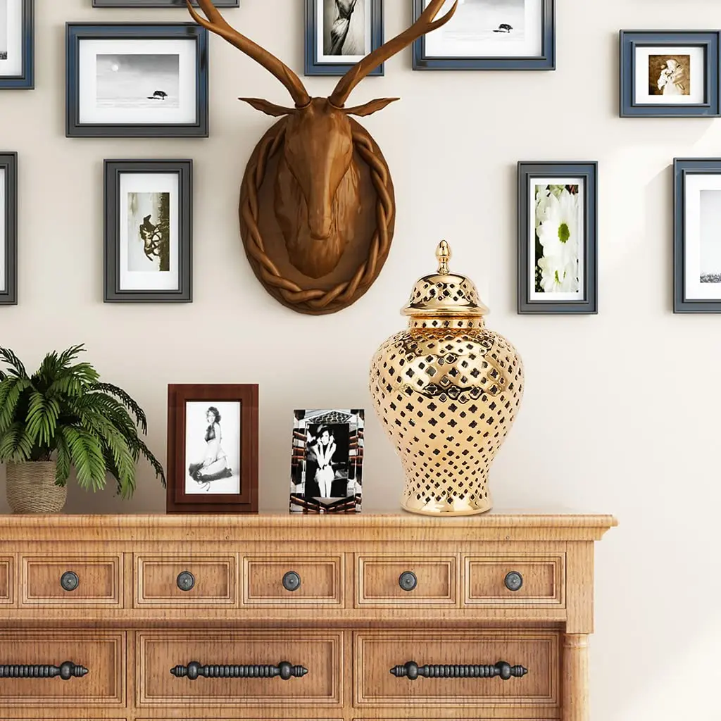 Круглая Золотая керамическая банка имбиря с крышкой, круглая банка для хранения, ваза для бутонов, резная решетчатая банка для дужек для домашнего декора