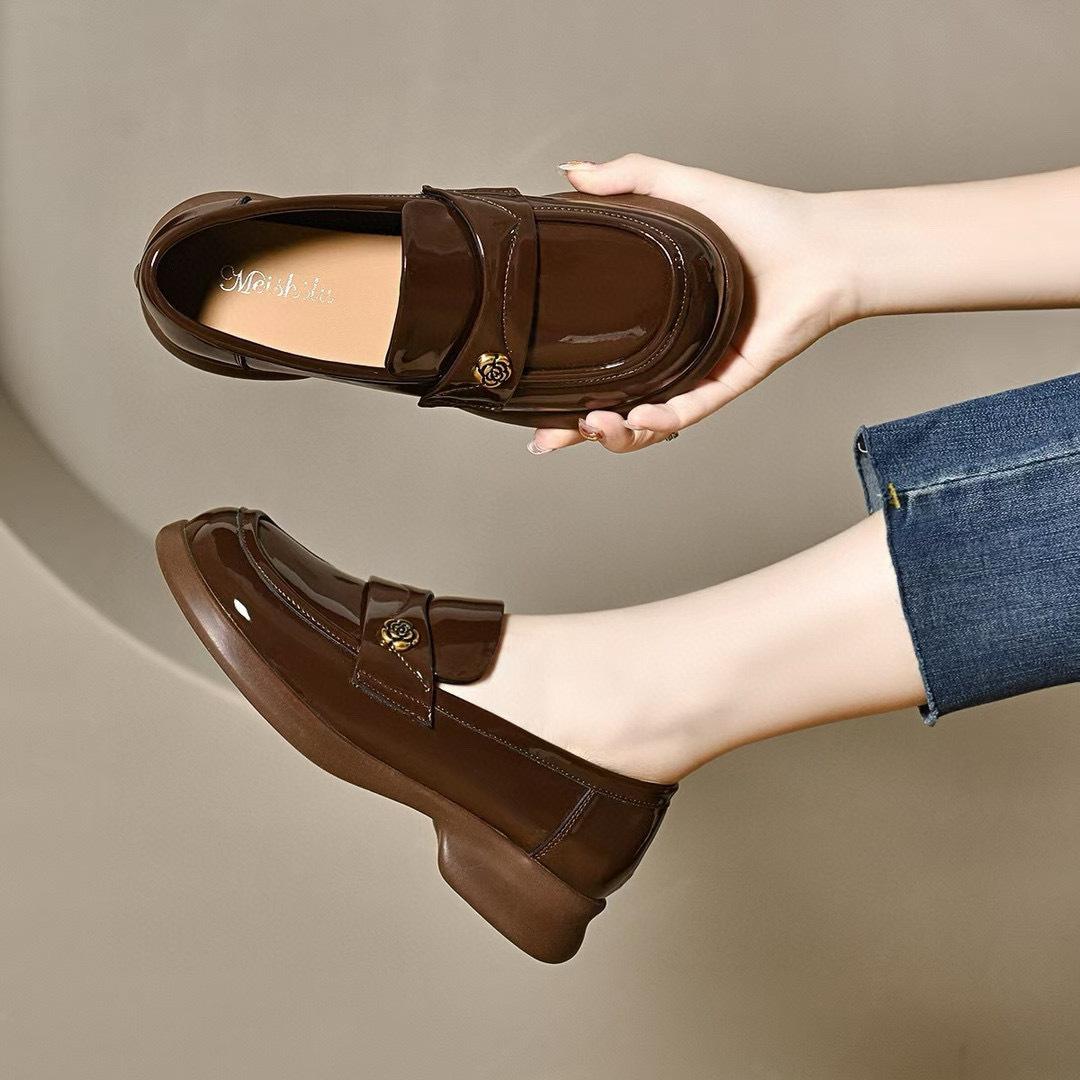 Круглые мокасины женские 2024 осень новые лакированные кожаные туфли с плоской подошвой на одной педали всесезонные женские туфли для поездок на работу кожаные туфли 40 коричневый