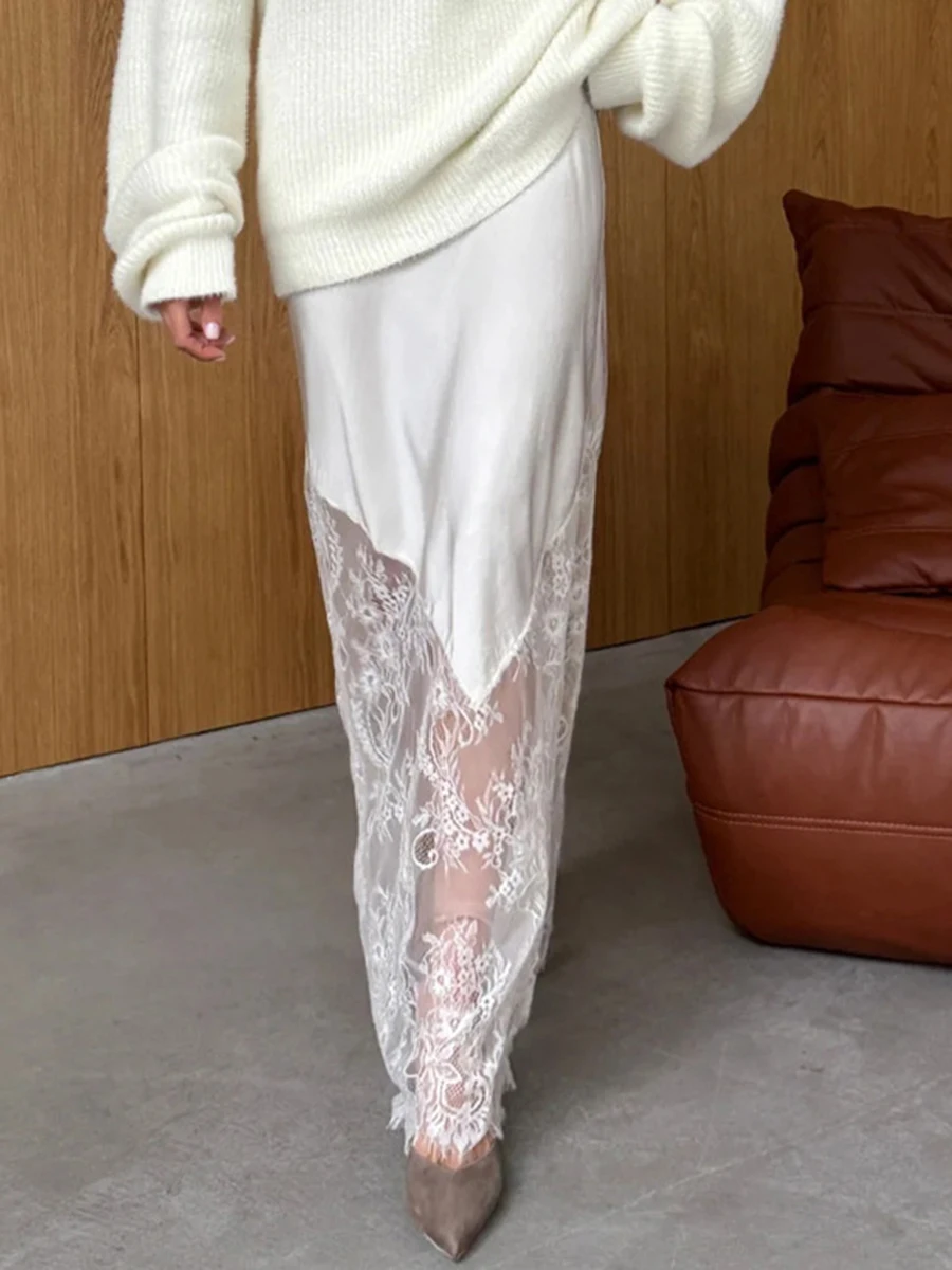 Кружевная лоскутная атласная длинная юбка женская летняя молния с высокой талией элегантная трапециевидная женская элегантная простая модная макси-юбка