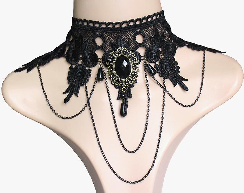 Кружевное панк-ожерелье с широким вырезом и драгоценными камнями - Черное