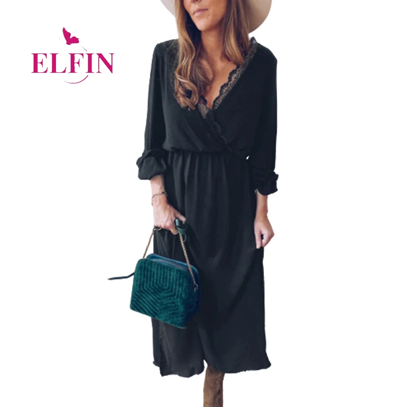 Кружевное платье в стиле пэчворк черный сексуальный v-образный вырез Женская Повседневная Осенняя обувь тонкий вечернее платье с длинным р...