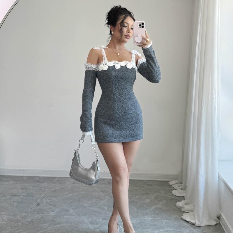 Кружевное платье на одно плечо, вязаная юбка, женское платье-свитер S серый