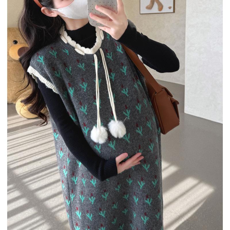 Кружевной жилет на шнуровке, комплект платья, осень и зима, новый, с цветочным дизайном, уменьшающий возраст, большого размера, вязаный комплект из двух предметов One size