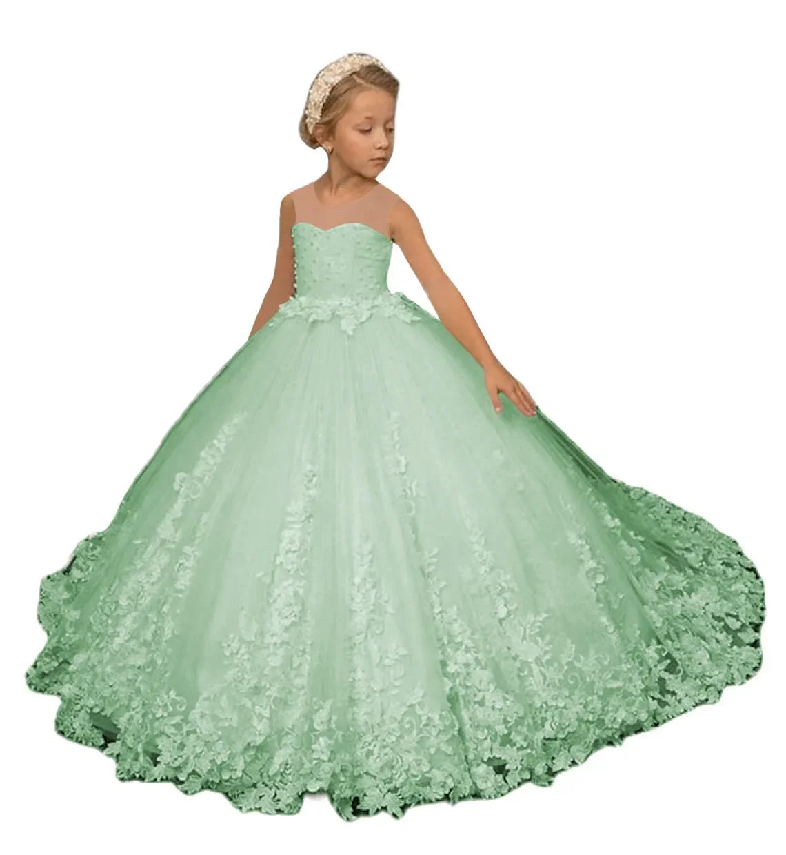 Кружевные платья с цветочной аппликацией для девочек на свадьбу, детское пышное платье принцессы с прозрачным вырезом, индивидуальное платье для первого причастия на день рождения
