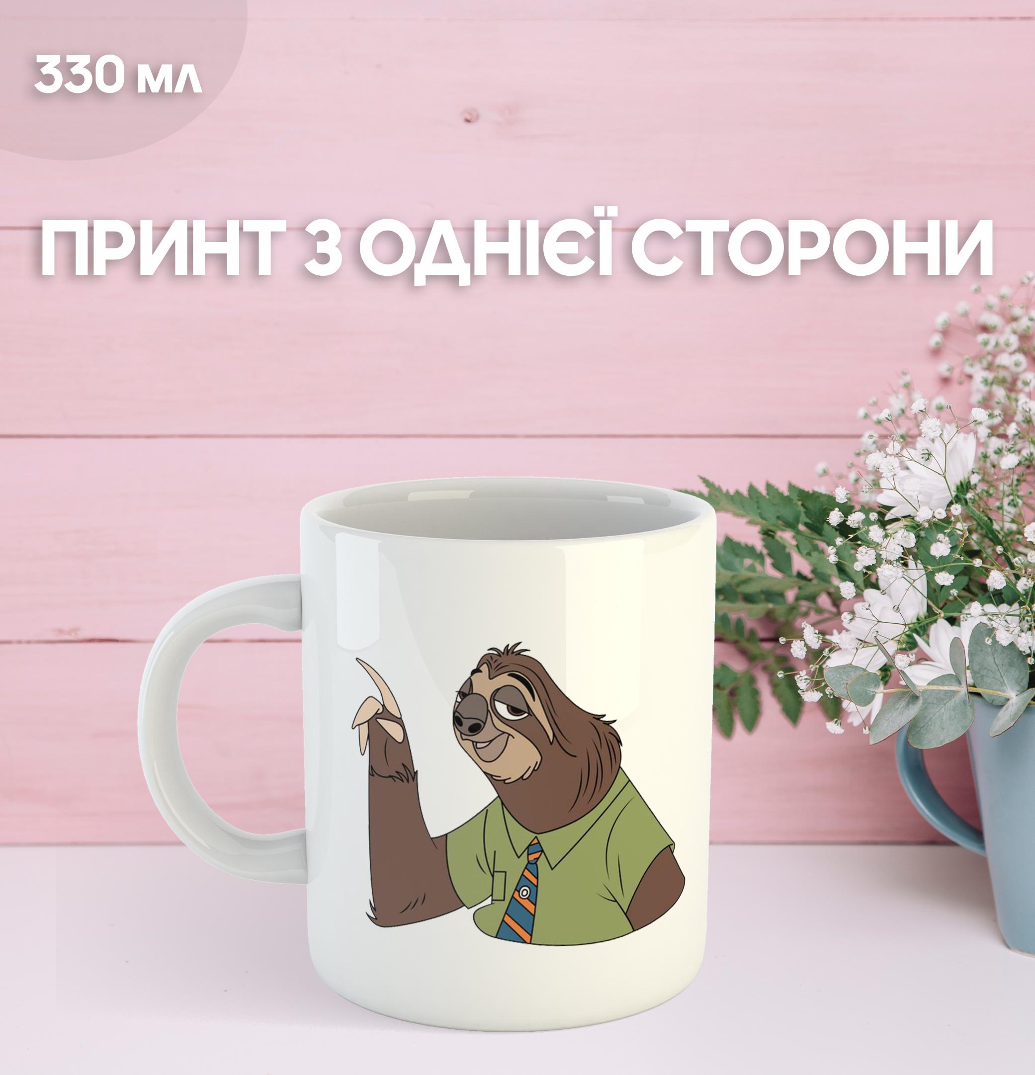 Кружка Ленивец Зверополис Зоотрополис Шмиг с принтом керамическая чашка уникальная яркая Zootropolis Zootopia 330 мл 9.5 білий