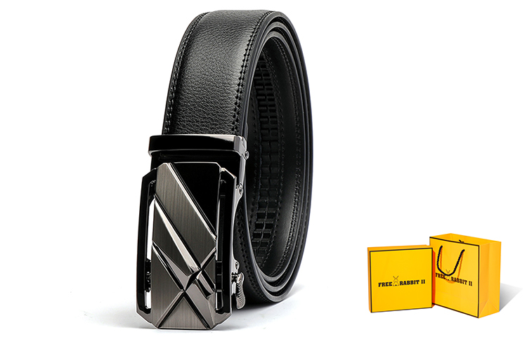 Крутой кожаный ремень с автоматической пряжкой, молодежный пояс для брюк мужской черный FREE RABBITⅡ, черный+подарочная упаковка лимитированная серия