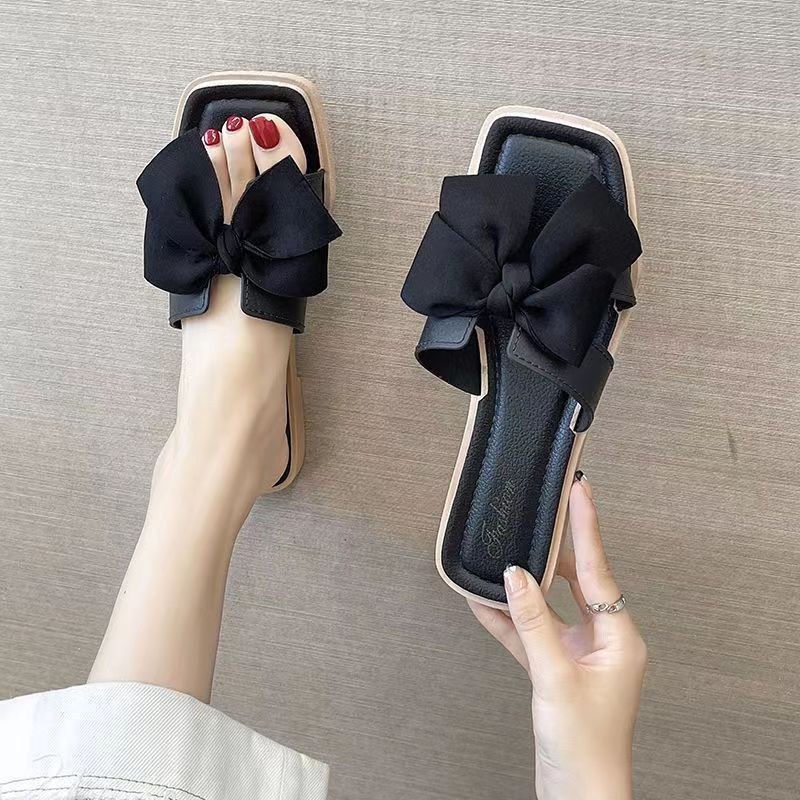Крутые тапочки женские летние на плоской подошве с бантом для улицы модные тапочки ins универсальные ленивые пляжные тапочки 40-41 fits 39-40 feet