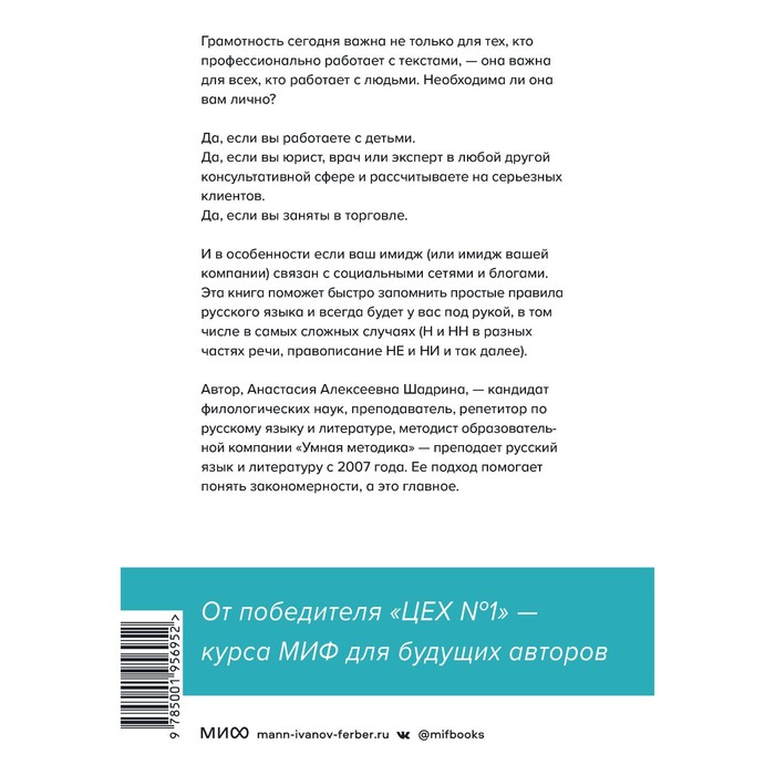 Научно-популярная книга о правилах и закономерностях русского языка. Коротко и ясно о самых сложных случаях.Грамотность сегодня важна не только для тех, кто профессионально работает с текстами, — она важна для всех, кто работает с людьми. Необходима ли она вам лично?Да, если вы работаете с детьми. Да, если вы юрист, врач или эксперт в любой другой консультативной сфере и рассчитываете на серьёзных клиентов. Да, если вы заняты в торговле. И в особенности если ваш имидж (или имидж вашей компании) связан с социальными сетями и блогами.Эта книга поможет быстро запомнить простые правила русского языка и всегда будет у вас под рукой, в том числе в самых сложных случаях (Н и НН в разных частях речи, правописание НЕ и НИ и так далее).Для кого эта книга:Для всех, кому нужна грамотная речь.Кроме очевидного факта, что грамотность необходима всем, чья профессия связана с текстами (корректорам, редакторам, копирайтерам, журналистам), давайте вспомним, что грамотная речь нужна и людям, которые работают в других сферах:- специалисты по работе с клиентами, продавцы-консультанты, торговые представители, администраторы — все, кто занят в торговле и общается с покупателями, должны в идеале обладать грамотной устной (а сейчас ещё и письменной) речью.- грамотности мы ждём от юристов, врачей, да и вообще от экспертов в различных сферах, несмотря на то что их профессионализм с этим вроде бы и не связан. ⠀- грамотную речь мы хотим слышать от всех, кто занимается с нашими детьми: от нянь, воспитателей детских садов, учителей и репетиторов.