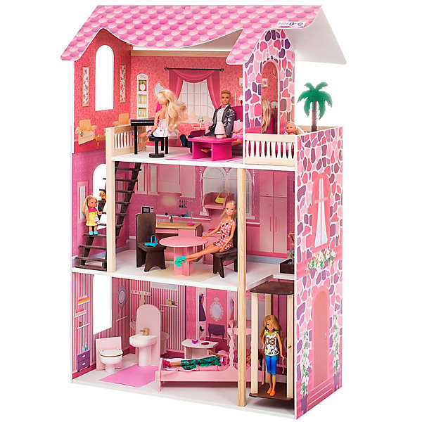 Кукольный домик выполнен в единой цветовой гамме, имеет 3 этажа. Задняя стенка полностью глухая, две боковые дополнены окошками и оформлены под камень. Внутри есть ванная, гостиная, кухня и спальня с балконом. Этажи соединяют лестница и ручной лифт. Много предметов интерьера нарисовано на стенах, что создает обустроенный внешний вид. Игрушка покрыта стойкими красками и сделана из качественных материалов.