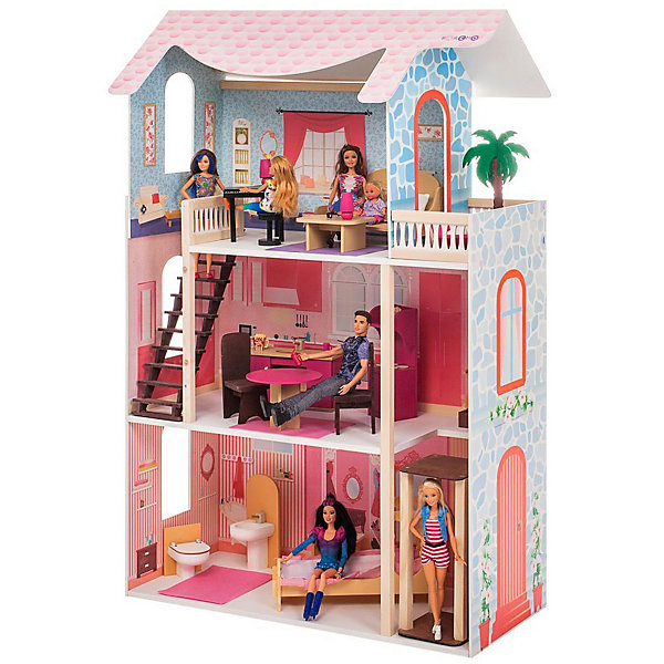 Кукольный домик выполнен в единой цветовой гамме, имеет 3 этажа. Задняя стенка полностью глухая, две боковые дополнены окошками и оформлены под камень. Внутри есть ванная, гостиная, кухня и спальня с балконом. Этажи соединяют лестница и ручной лифт. Много предметов интерьера нарисовано на стенах, что создает обустроенный внешний вид. Игрушка покрыта стойкими красками и сделана из качественных материалов.