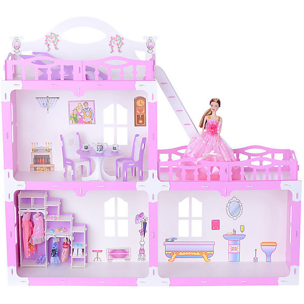 Домик для кукол трёхэтажный, имеет три комнаты и два открытых балкона. На первом этаже расположены ванная и прихожая, на втором столовая и балкон, а третий состоит только из балкона. Множество окошек, декоративные ограждения, лестница приставная. На шезлонге можно отдыхать, любуясь видами, в столовой стоит стол и стулья, а в прихожей гардероб, в котором можно хранить наряды на вешалках, расставлять обувь и раскладывать аксессуары. Красивые наклейки придадут внутренней отделке реалистичности. Благодаря удобным замочкам-защёлкам легко собрать и разобрать, можно брать с собой.