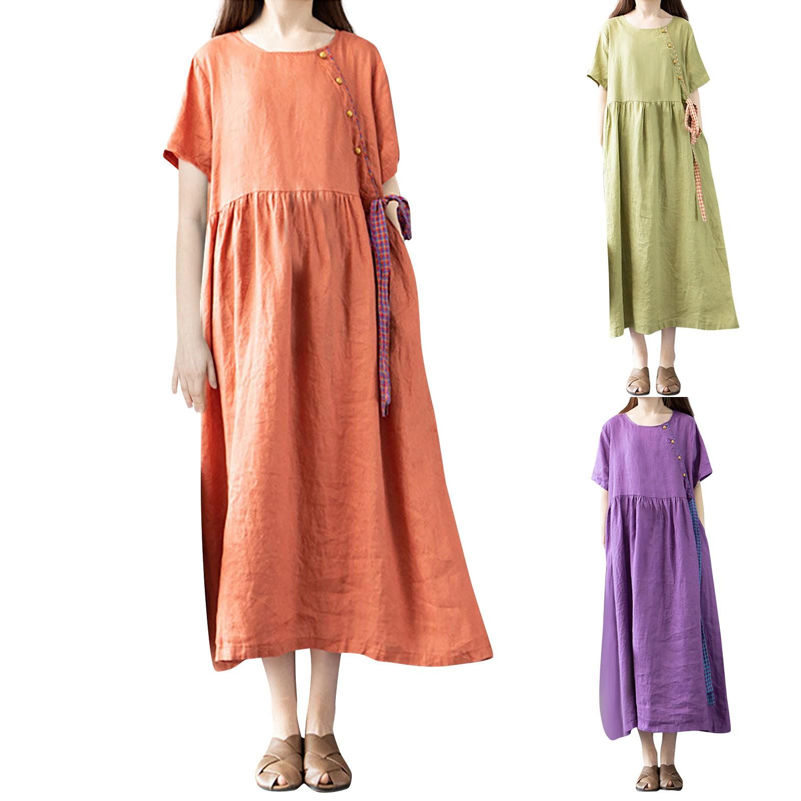 (Куниде) Женская летняя литература Большая свободная крепкая хлопчатобумажная ткань Круглая шея Короткий рукав Средней длины Платье