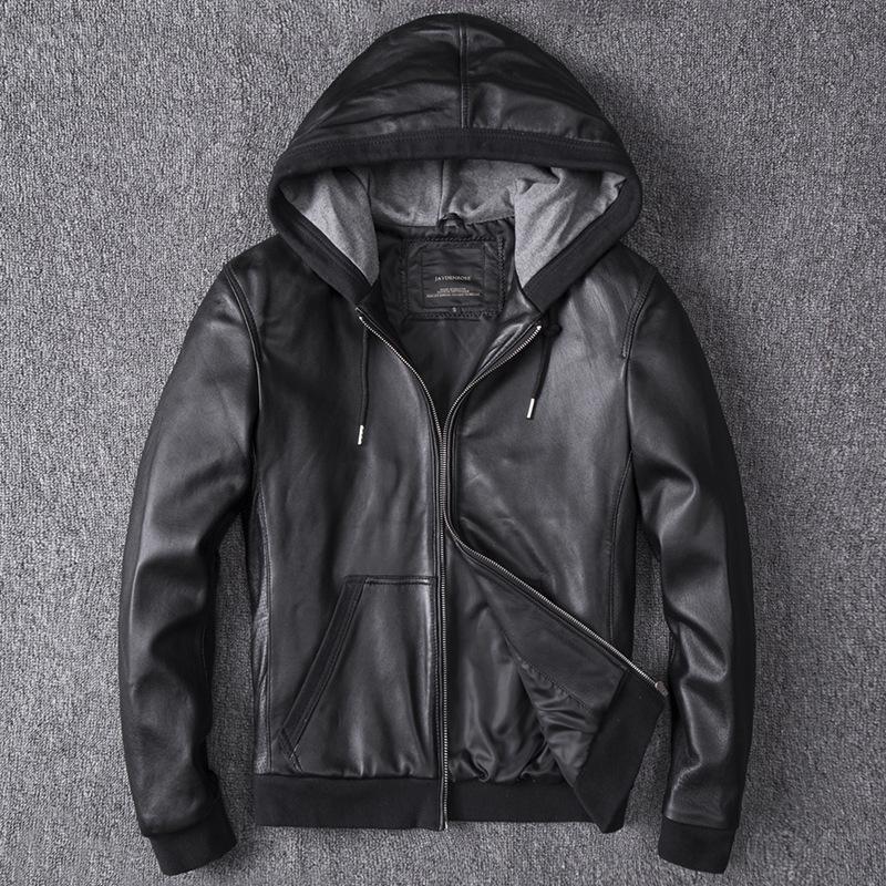 Куртка из овчины с капюшоном Натуральная кожа Мужская короткая куртка с капюшоном Весенне-осенний стиль Межсезонье Спорт и отдых XXXXL чёрный