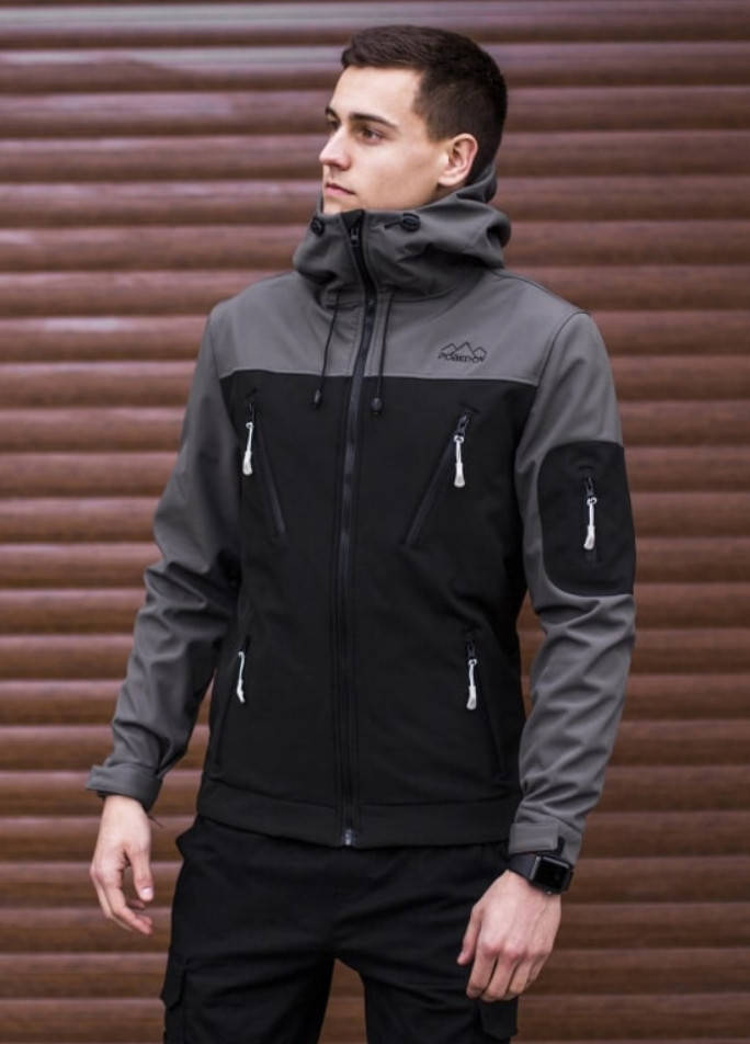 Куртка мужская спортивная SoftShell с капюшоном стильная молодежная демисезонная осень весна серо-черная